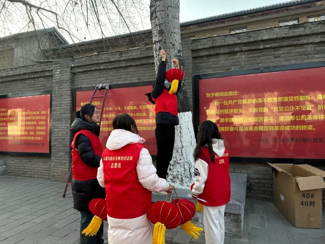 新年伊始,西安八路军办事处纪念馆会定期更新展览内容,在此过程中,我校志愿者发挥自身优势,全力协助工作人员进行展览布置。从物品的搬运、摆放,到展板的设计、悬挂,每一个环节都有志愿者们忙碌的身影。志愿者们积极协助工作人员挂灯笼、布置祈福心愿板,赶在农历新年来临前为场馆增添新年气氛。