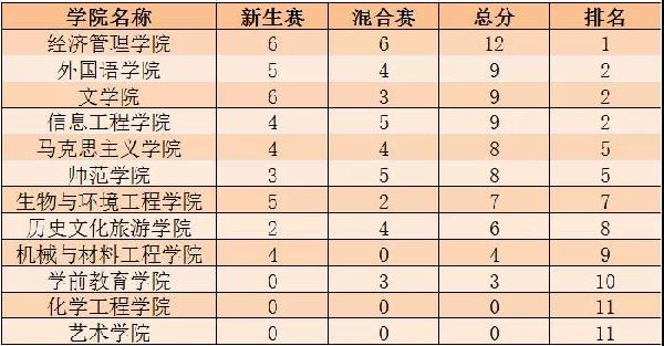 注:积分相同的学院按首字母顺序排序,其余排名不分先后,每场比赛结束后积分榜实时更新。