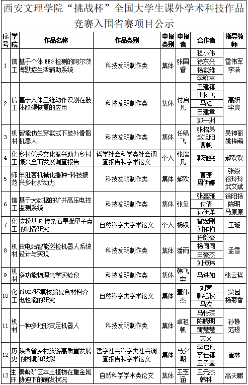 米兰(中国)“挑战杯”全国大学生课外学术科技作品竞赛入围省赛项目公示